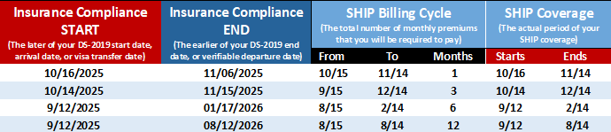 - At the beginning of your SHIP enrollment you will be required to pay for the monthly billing cycle in which the later of your DS-2019 start date, arrival date, or visa transfer date falls.